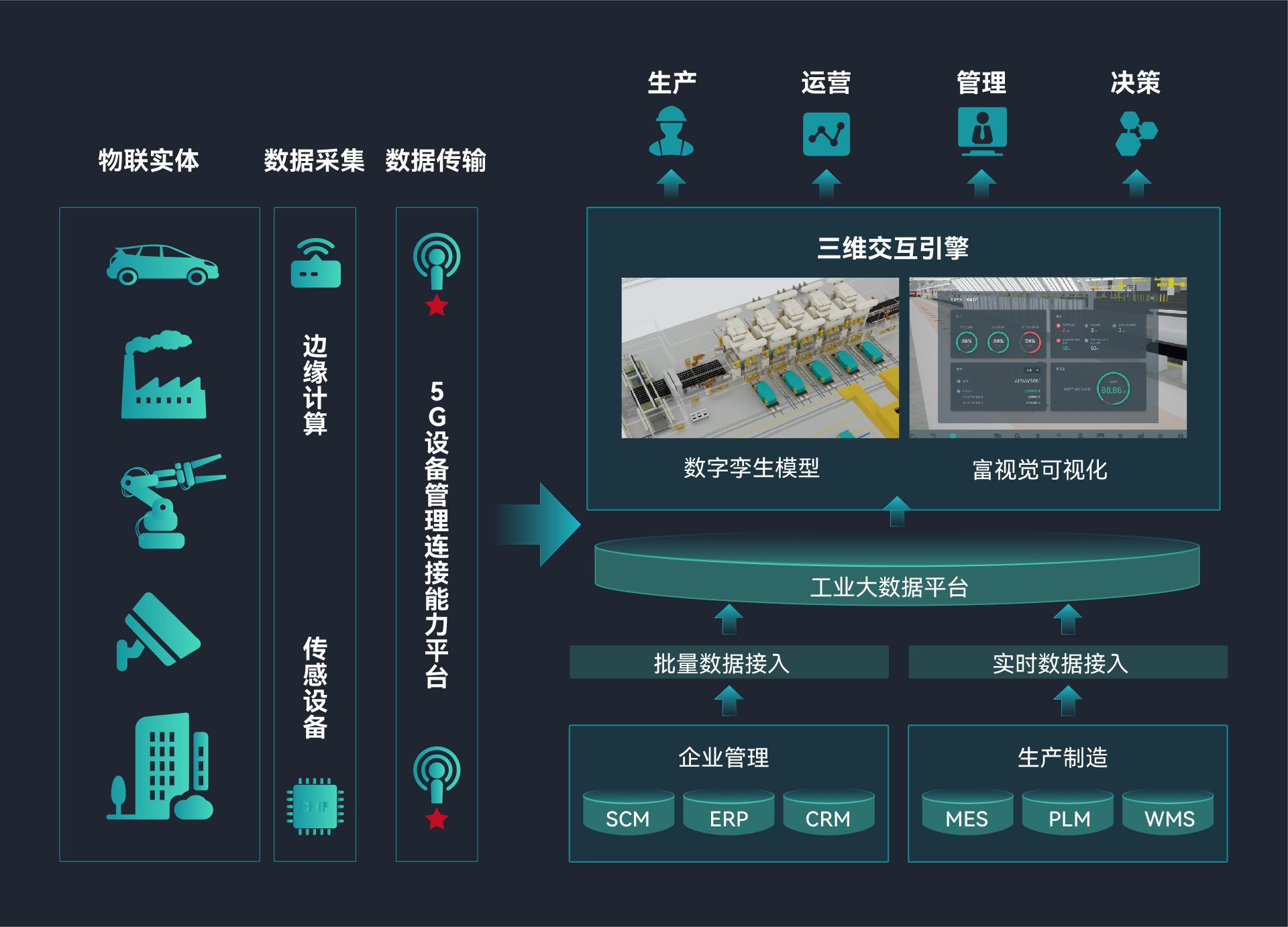 通过真实场景与数据的完美融合和实时呈现,真实再现实际的生产状态,有助于管理者更高效直观的获知数据,并作出相应决策,甚至可以对决策进行模拟推演,以达到最优化决策的目的。